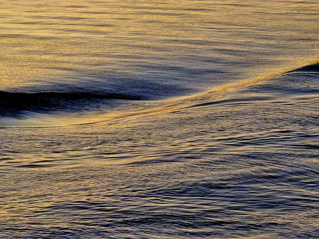The wind blowing on to shore has created gold as the sand is picked up and catches the late sunlight