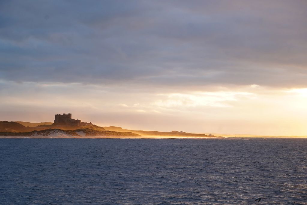 Bamburgh Castle at sunset after a stormy day.